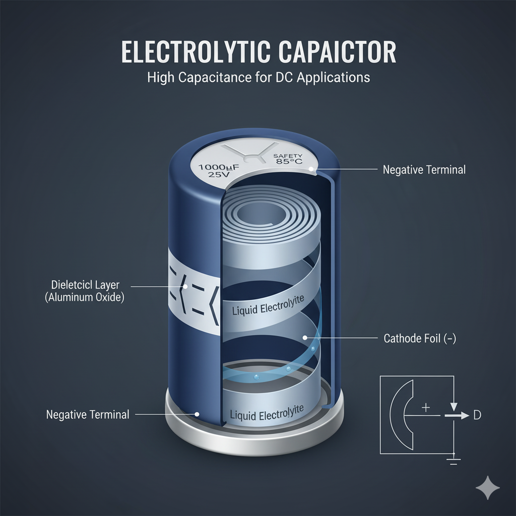 2. Electrolytic Capacitors – High capacitance, usually polarized, often used in power supplies.