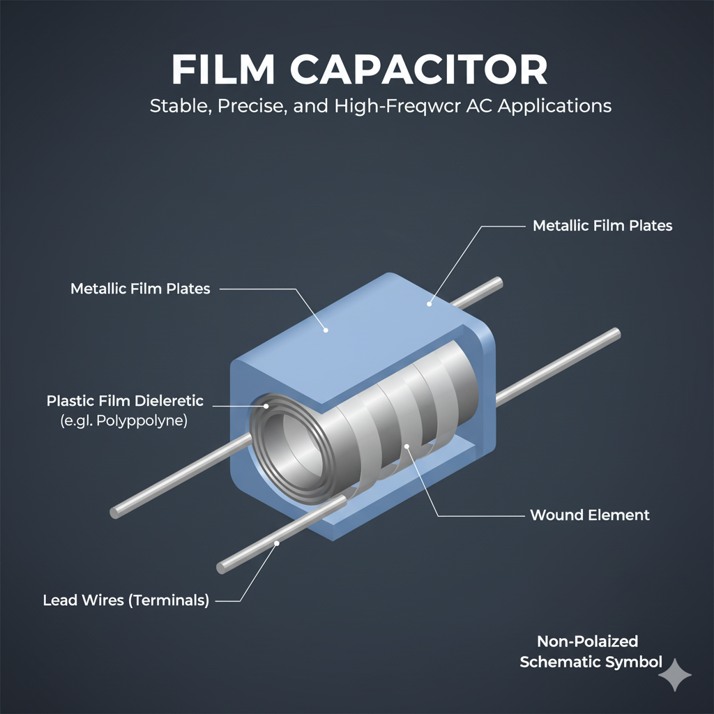 4. Film Capacitors – Low loss, used in AC circuits and audio electronics.