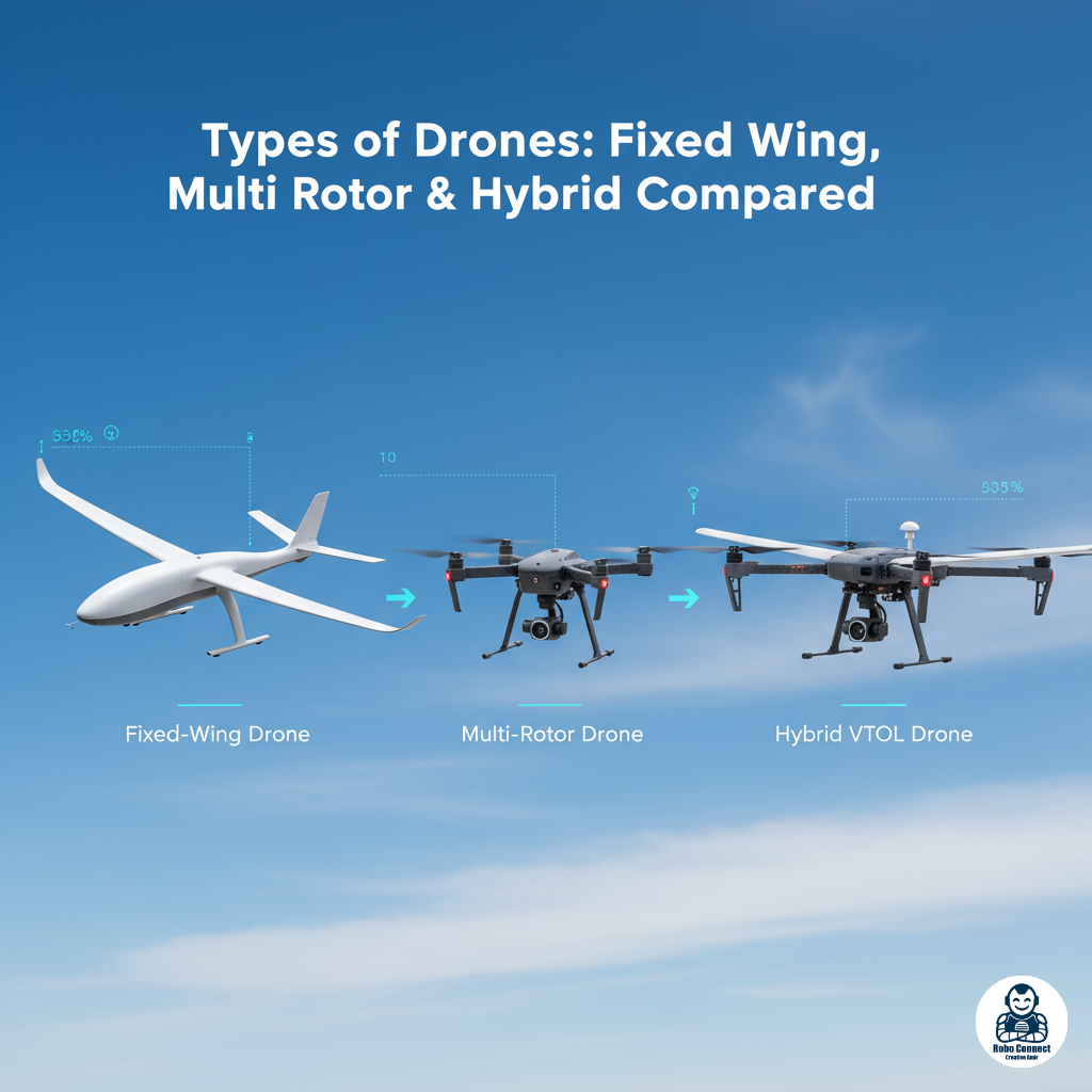- Hybrid (VTOL): Future of commercial drones → Flexible but costly.